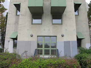......Stirling's Social Science Research Campus. This is one Stirling building that I'm pretty ambivalent about. Good points: it has a completely ridiculous plan - how I would have loved to witness the client presentation when he suggested a basilica crashed into an octagonal tower as the best solution for the cafeteria block. It has his trademark horrible colours and some full-on Post Modern silliness in the Gothic arches and ruinous fragments that adorn the garden. Bad points: all of the above plus the disturbing way the various building 'types' collide at the corners which, to be fair, is much more distressing in plan than in reality.